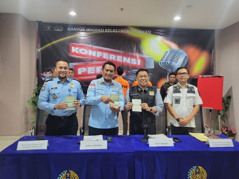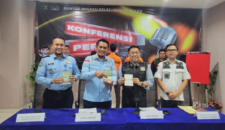 Kepala Divisi Imigrasi Wilayah Hukum dan Ham Jawa Barat, Yayan Indriana didampingi Kepala Kantor Imigrasi Bekasi, Berthi Mustika dalam Konfrensi Pers nya Menjelaskan Kronologi Penangkapan ke tiga WNA tersebut