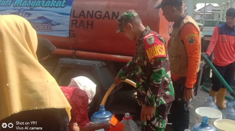 LAMPUNG.GERBANGPATRIOT.COM – Serang,  Bintara Pembina Desa (Babinsa) Koramil 0602-06/Kasemen Kodim 0602/Serang Kopral Satu (Koptu) Donny, membantu Bandan Penanggulangan Bencana Daerah (BPBD) Provinsi Banten, menyalurkan bantuan pasokan air bersih akibat terjadi kemarau yang disebabkan fenomena El Nino, di Lingkungan Kisalah Tiga Desa Kisalah Kecamatan Kasemen Kota Serang Provinsi Banten, Sabtu (16/09/2023).