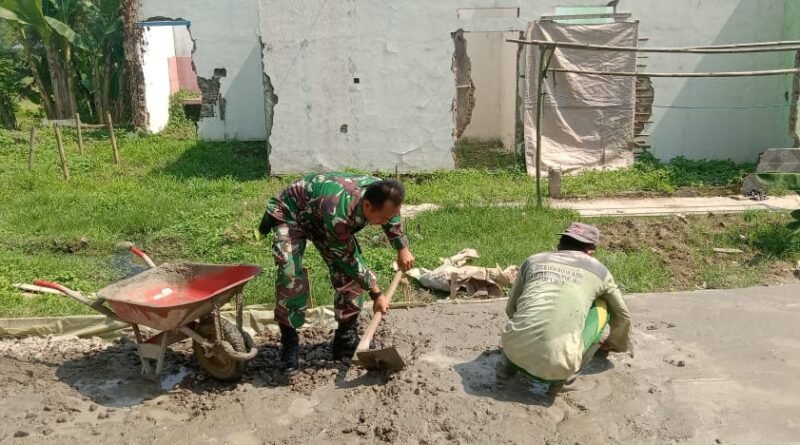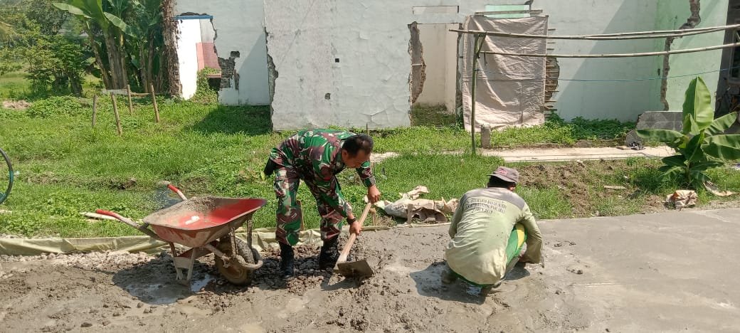 Percepat pembangunan di wilayah, Babinsa Koramil 0602-09/Cikeusal Bantu pengerjaan betonisasi Jalan Desa