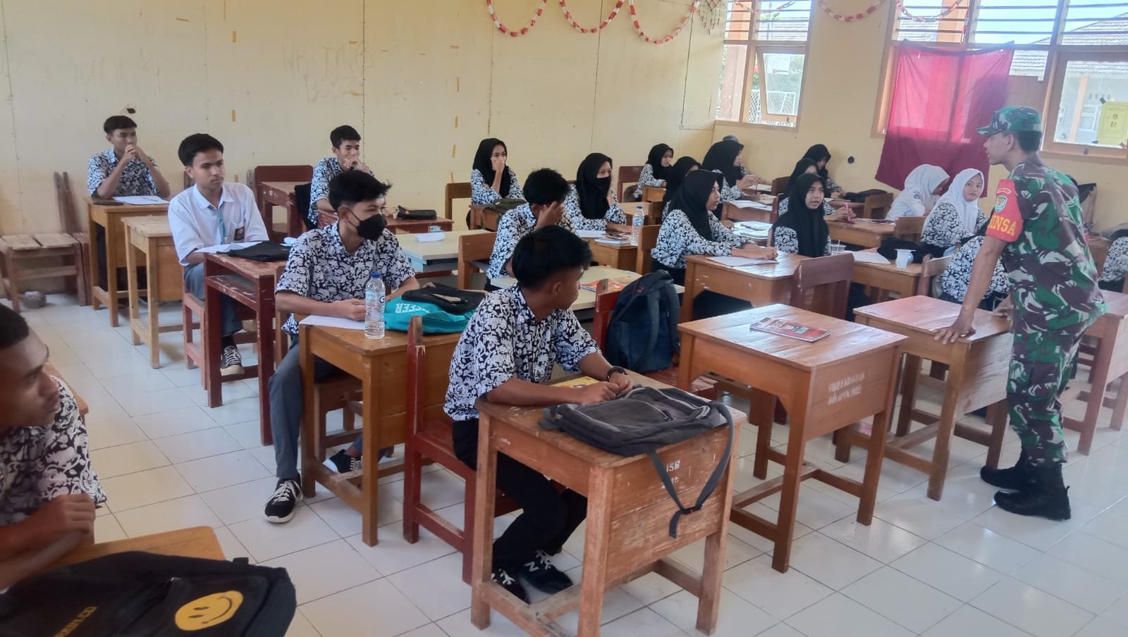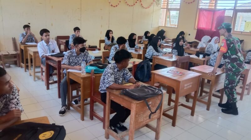 LAMPUNG.GERBANGPATRIOT.COM – Serang, Untuk meningkatkan semangat belajar dan rasa kecintaan terhadap bangsa dan negara, Sertu Ahdi Bintara Pembina Desa (Babinsa) Koramil 0602-18/Kragilan Kodim 0602/Serang, memberikan materi tentang Wawasan Kebangsaan (Wasbang) kepada siswa siswi SMA Negeri 1 Kragilan, bertempat di Aula SMA Negeri 1 Kragilan Desa Pematang Kecamatan Kragilan Kabupaten Serang Provinsi Banten, Rabu (18/10/2023).