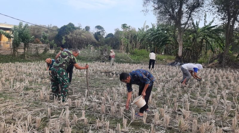 LAMPUNG.GERBANGPATRIOT.COM – Serang, Menjaga Ketahanan Pangan, Sersan Satu (Sertu) Sabar Widodo Bintara Pembina Desa (Babinsa) Koramil 0602-17/Carenang Kodim 0602/Serang, membantu para petani menanam Kacang Kedelai seluas 1 (Satu) Hektar memanfaatkan areal lahan persawahan yang mengering akibat kemarau panjang, bertempat di Kampung Blok Satu Desa Warakas Kecamatan Binuang Kabupaten Serang Provinsi Banten, Jum’at (20/10/2023).