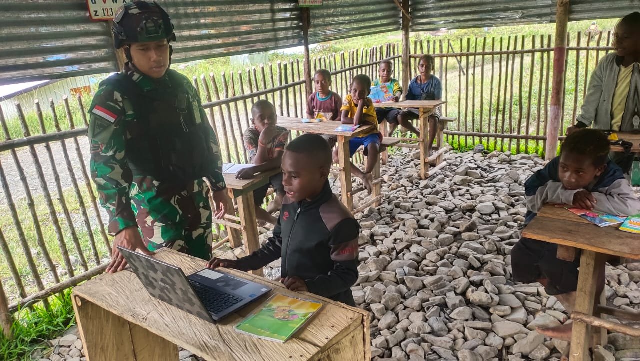 Memperkenalkan Teknologi, Satgas Yonif 115/ML Ajarkan Pengetahuan Dasar Komputer kepada Anak-Anak di Kampung Wuyuneri