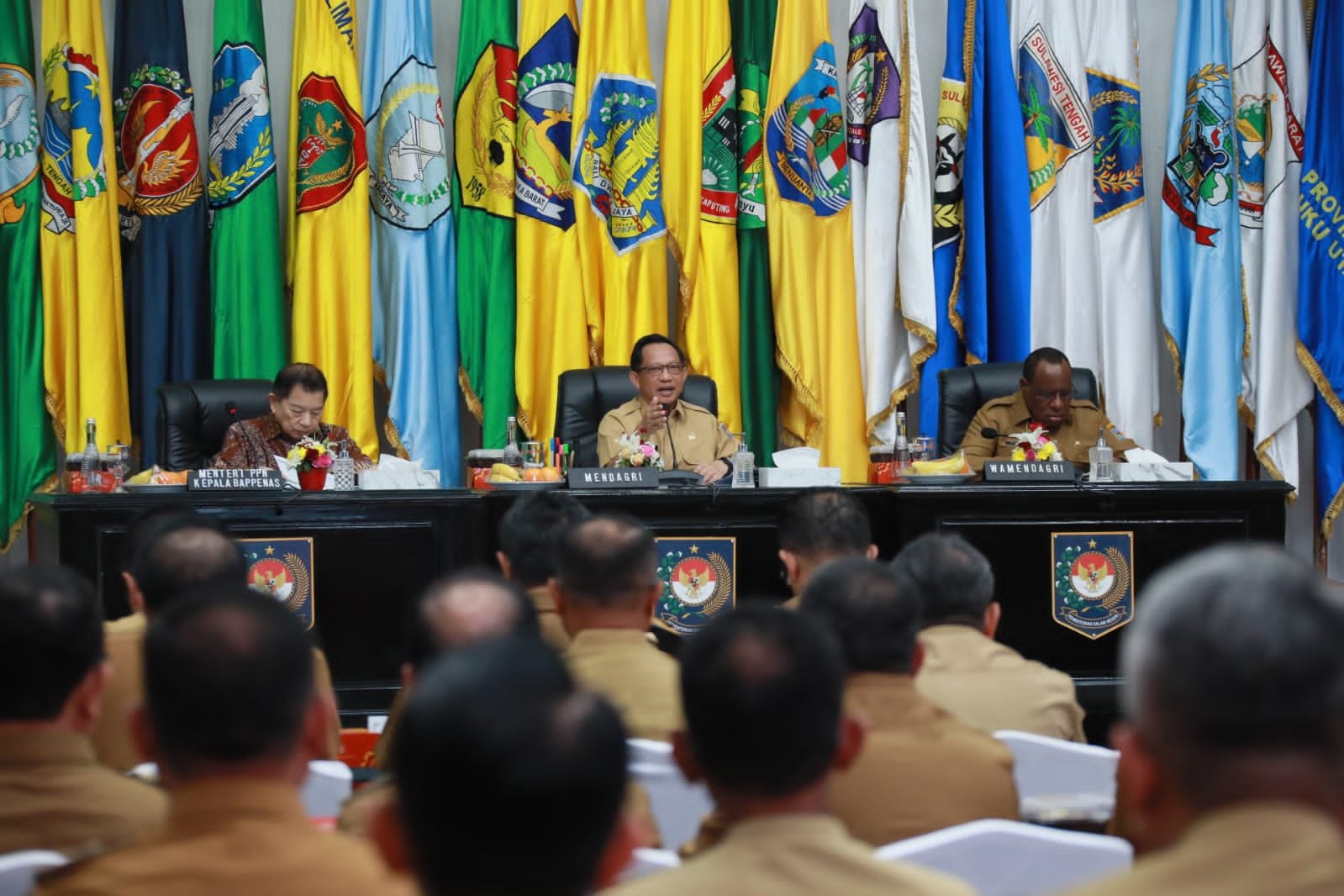 Hadir pada rakor ini, Wakil Menteri Dalam Negeri (Wamendagri) John Wempi Wetipo, serta jajaran pejabat tinggi madya di lingkungan Kemendagri dan Badan Nasional Pengelola Perbatasan (BNPP).(Wan)
