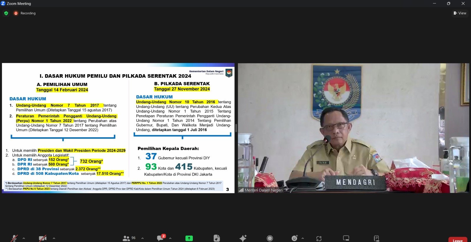 “Kemudian khusus untuk KPUD dan Bawaslu daerah itu saya sudah mengeluarkan surat (agar anggaran Pilkada) untuk dapat dicairkan 14 hari setelah penandatanganan naskah hibah (NPHD). Saya sudah mengeluarkan Surat Edaran mengingatkan tentang mekanisme ini itu pada (tanggal 24) Januari tahun 2023,” ujar Mendagri saat memimpin Rapat Koordinasi Percepatan Penandatanganan NPHD Kegiatan Pilkada Tahun 2024 Provinsi Sumatera Barat secara virtual dari Kantor Kementerian Dalam Negeri (Kemendagri), Selasa (28/11/2023).
