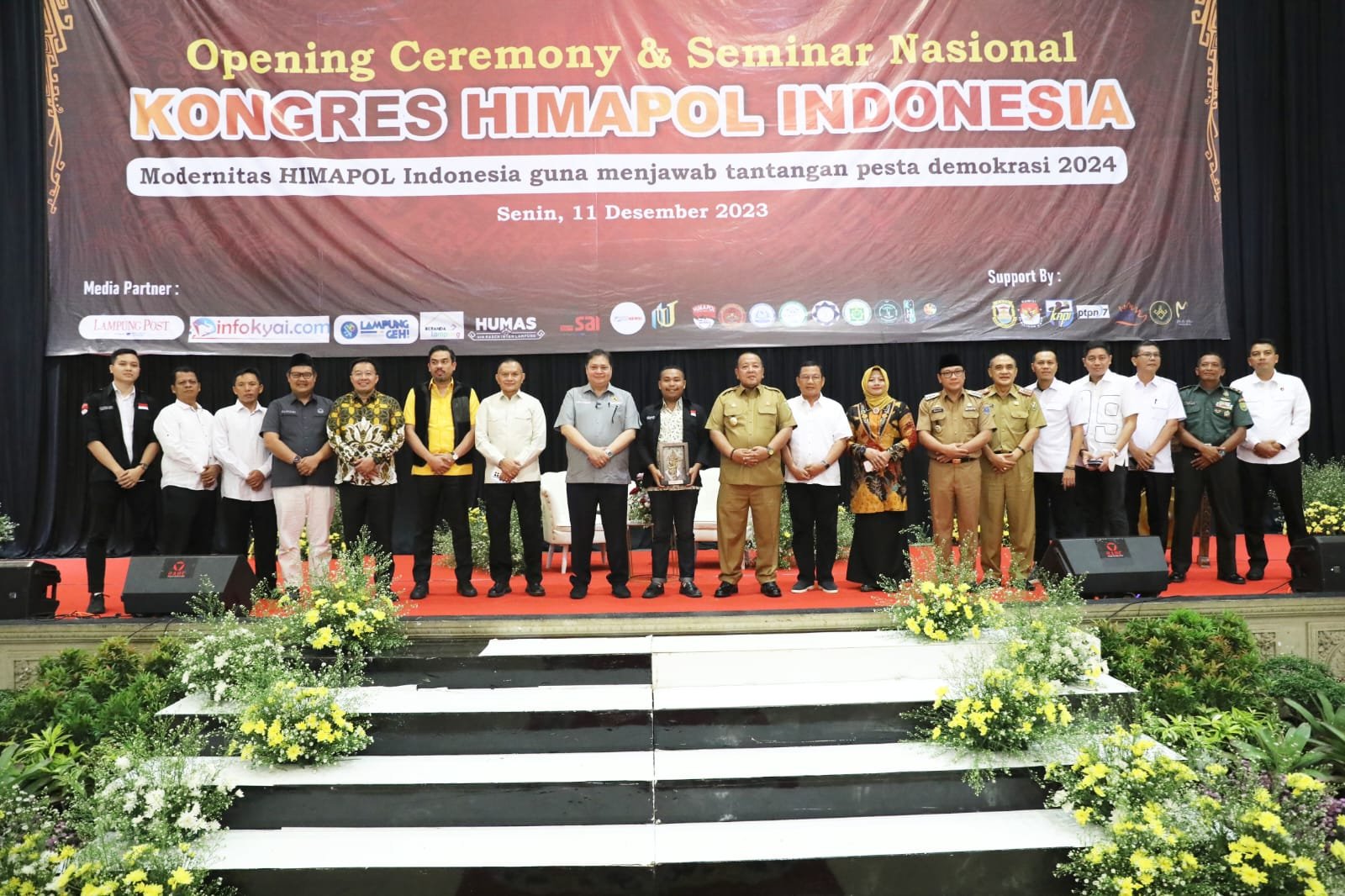 LAMPUNG.GERBANGPATRIOT.COM – Bandar Lampung, Menteri Koordinator Bidang Perekonomian Republik Indonesia Airlangga Hartanto, didampingi Gubernur Lampung Arinal Djunaidi membuka Kongres Nasional Himpunan Mahasiswa Ilmu Politik Indonesia VIII, di Gedung Bagas Raya, Bandar Lampung, Senin (11/12/2023).